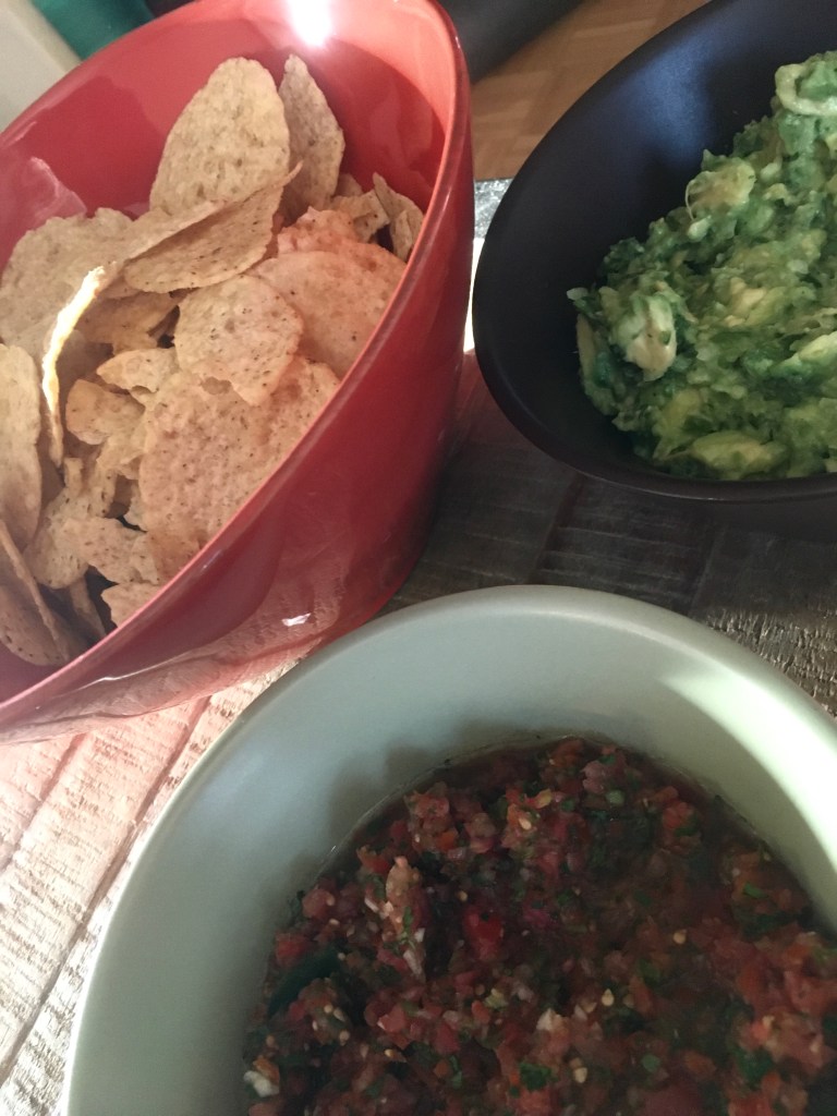 So yeah. Back to cooking. Salsa, guac, spinach and artichoke dip, mini key lime pies… Mmm. Unfortunately, I have to remember there are only two of us, but face it. We can eat. And drink, but who’s counting?