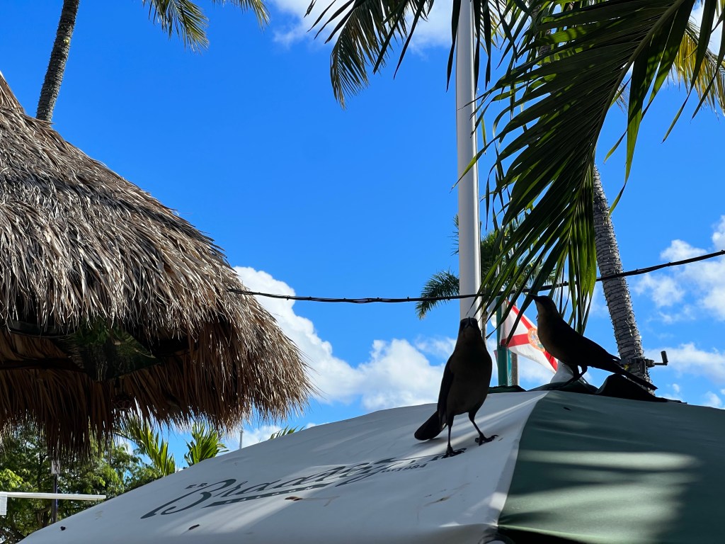 By the time we made it back around to the west side of the Intracoastal, we were hungry. Lunch was at EJ Bradley’s, an old favorite. At which we were accompanied by the most random bunch of birds….