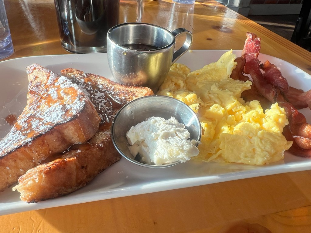 French toast, eggs, and bacon were on point at Creekside across the street from the hotel. We went back to the room, finished packing our stuff, and were off.