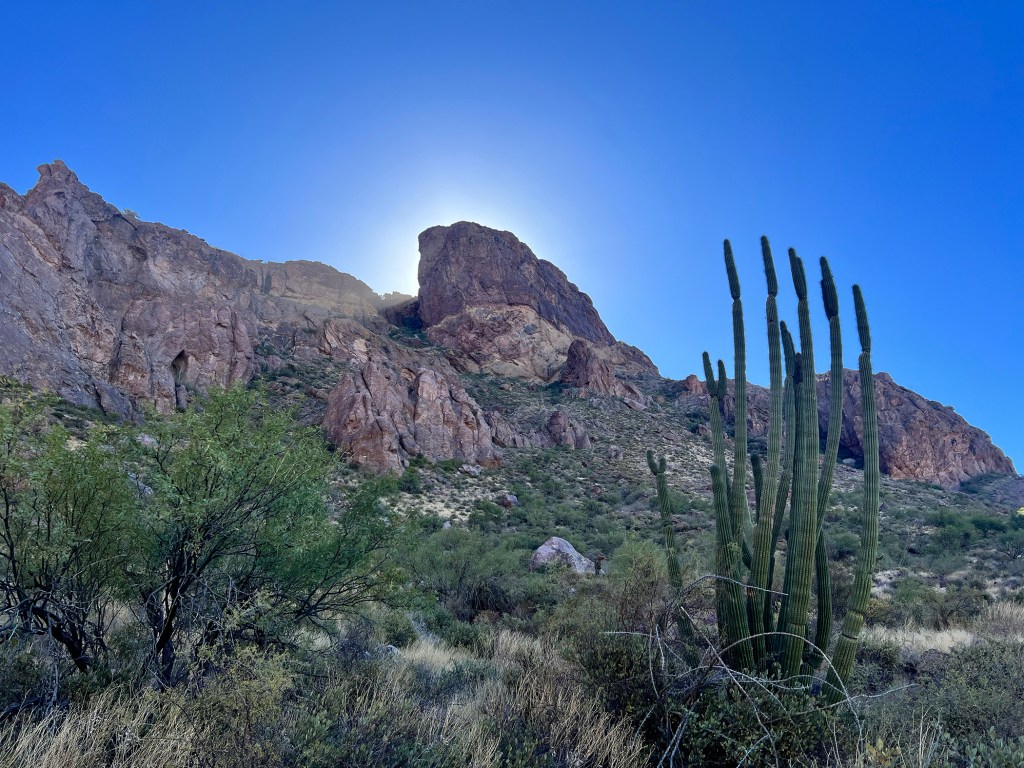 The next pull off was our next hike. We climbed up to Bull Pasture and got a good view of Ajo Peak (Ajo Mountain? Not sure.). We went back via the Estes Canyon Trail, which had – you guessed it – more organ pipe cactus. And saguaros. And cholla and ocotillo. So cool.
