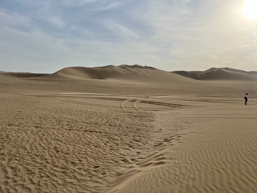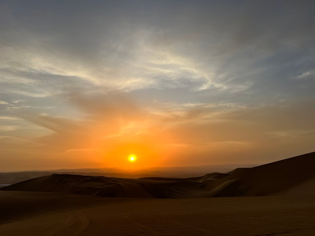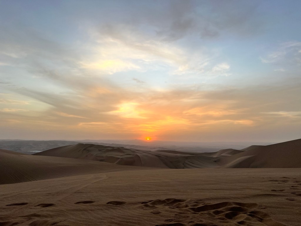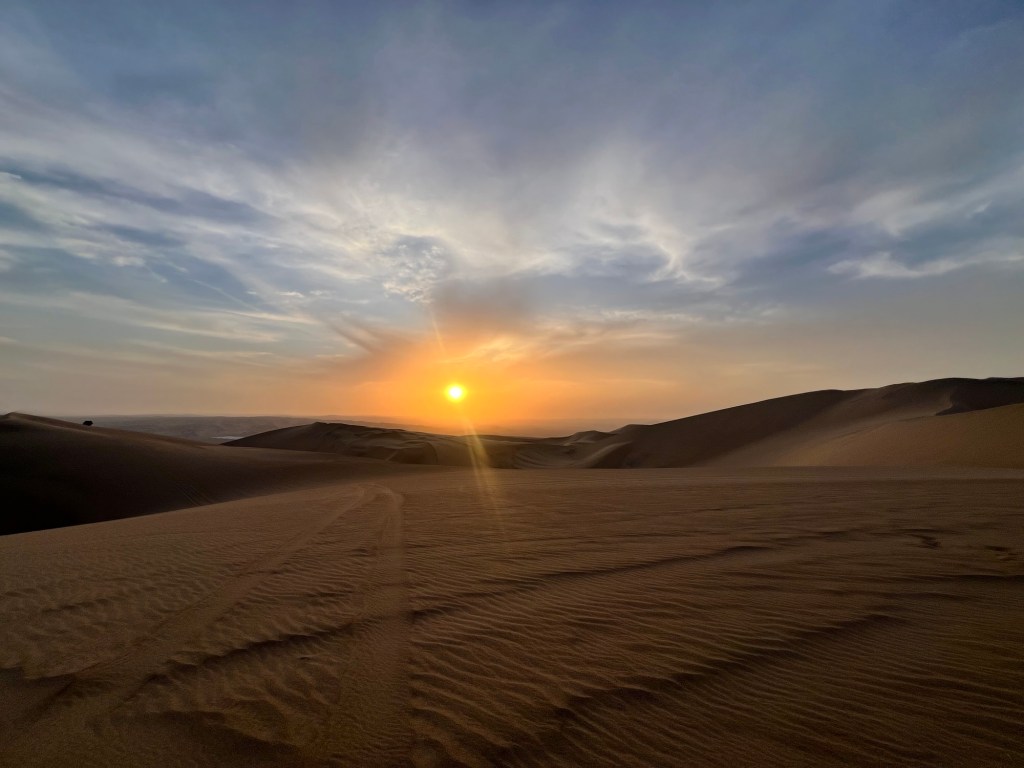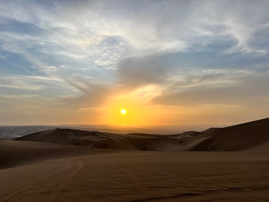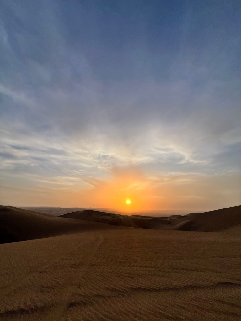 We stopped in between drives and went sand boarding. I wasn’t going to do it, but after the first ride back down a dune to pick up those that had, I realized sliding down the dunes on a board was way less scary than being driven down. We stopped at three or four dunes and slid down. That was fun! Then we stopped one more time to watch the sun set over the dunes, which was beautiful. There was one more hair-raising drive back to the starting point, and we were done.