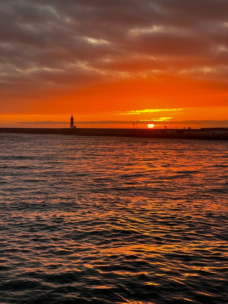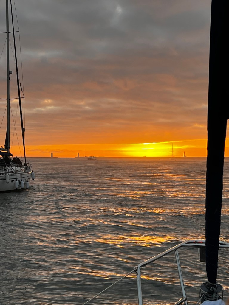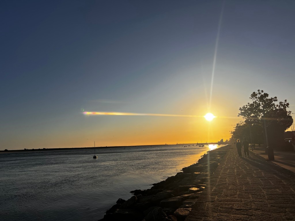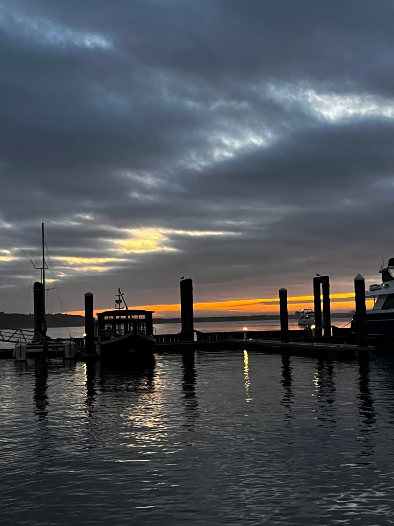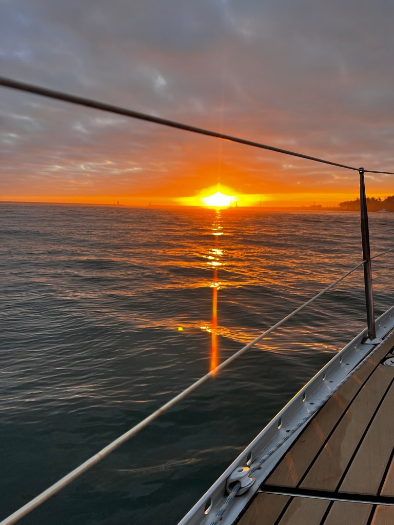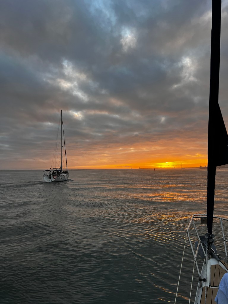 We did end up making it to the marina on time and got on board our sailboat for our river cruise. The cruise was a pleasant experience. The sailboat was funny, it didn’t even have a main and there was no actual sailing to be had. But the cushions were comfortable and the views of the cities from the river were beautiful, and when we turned around to watch the sun go down over the ocean, the clouds parted and we got a pretty awesome sunset.