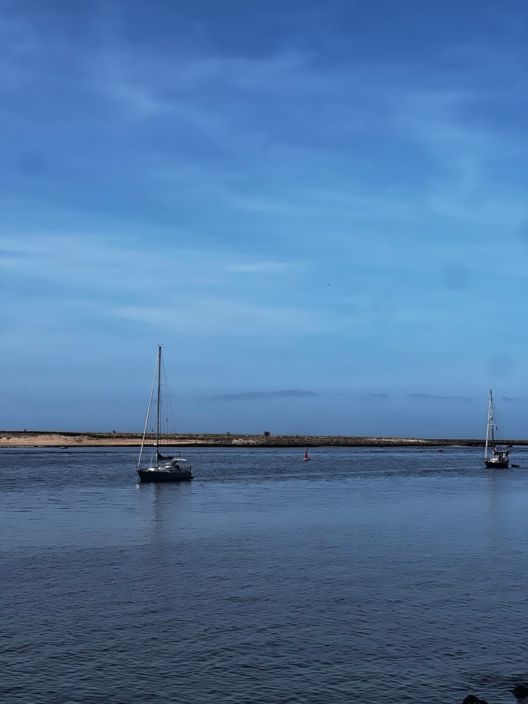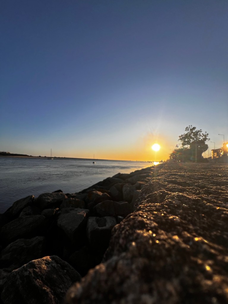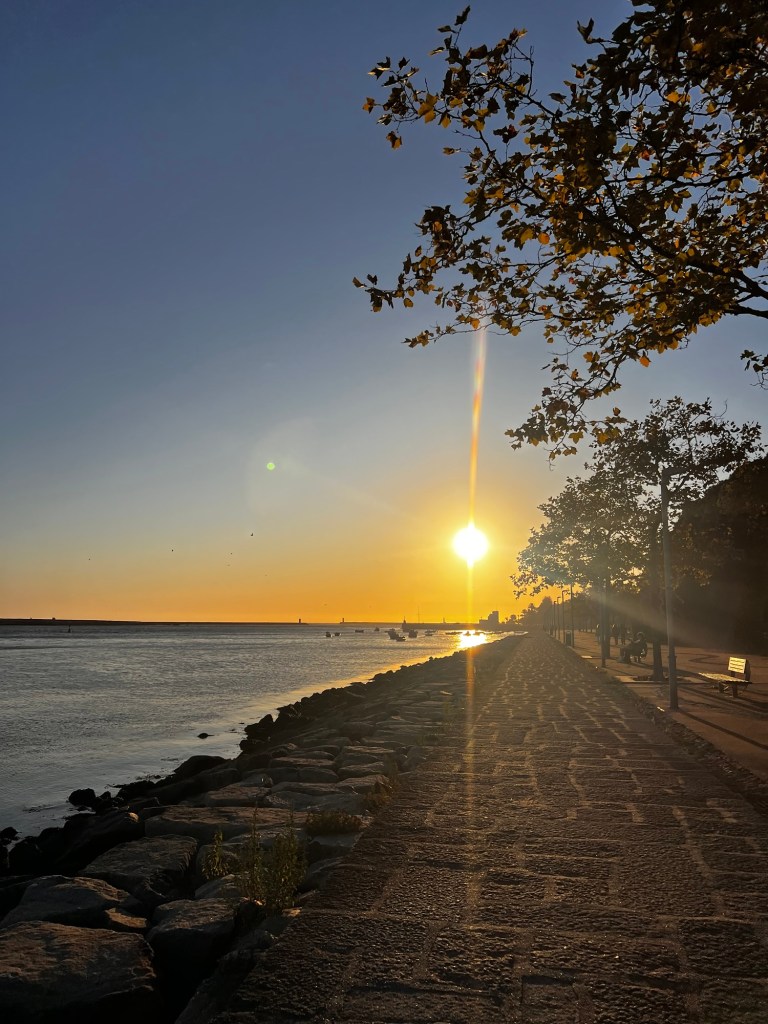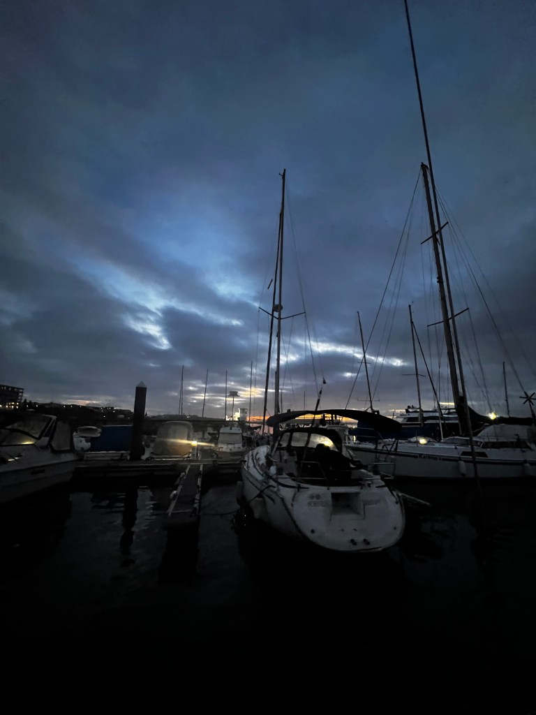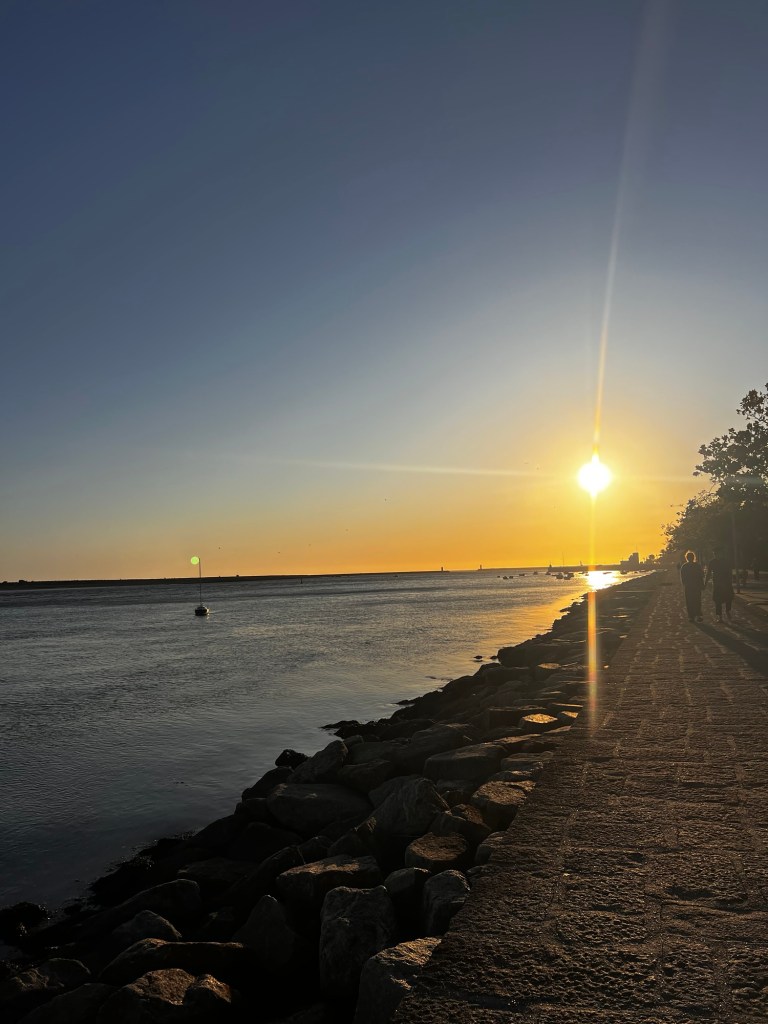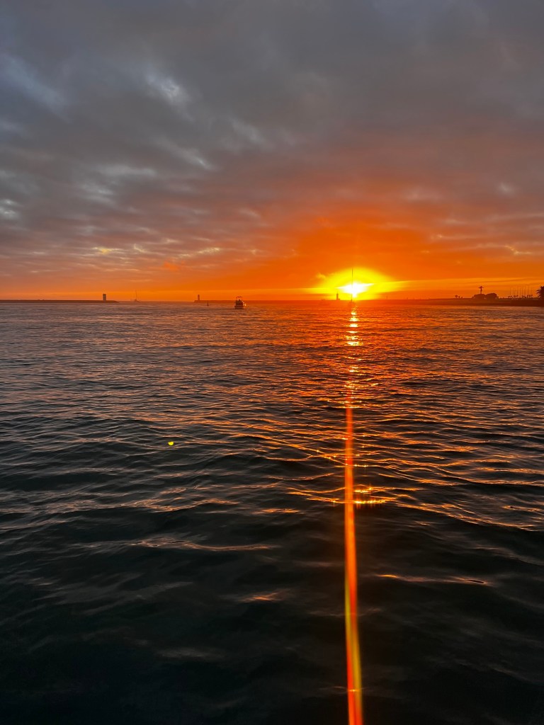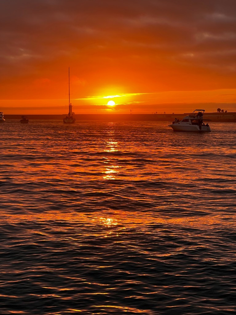 We did end up making it to the marina on time and got on board our sailboat for our river cruise. The cruise was a pleasant experience. The sailboat was funny, it didn’t even have a main and there was no actual sailing to be had. But the cushions were comfortable and the views of the cities from the river were beautiful, and when we turned around to watch the sun go down over the ocean, the clouds parted and we got a pretty awesome sunset.