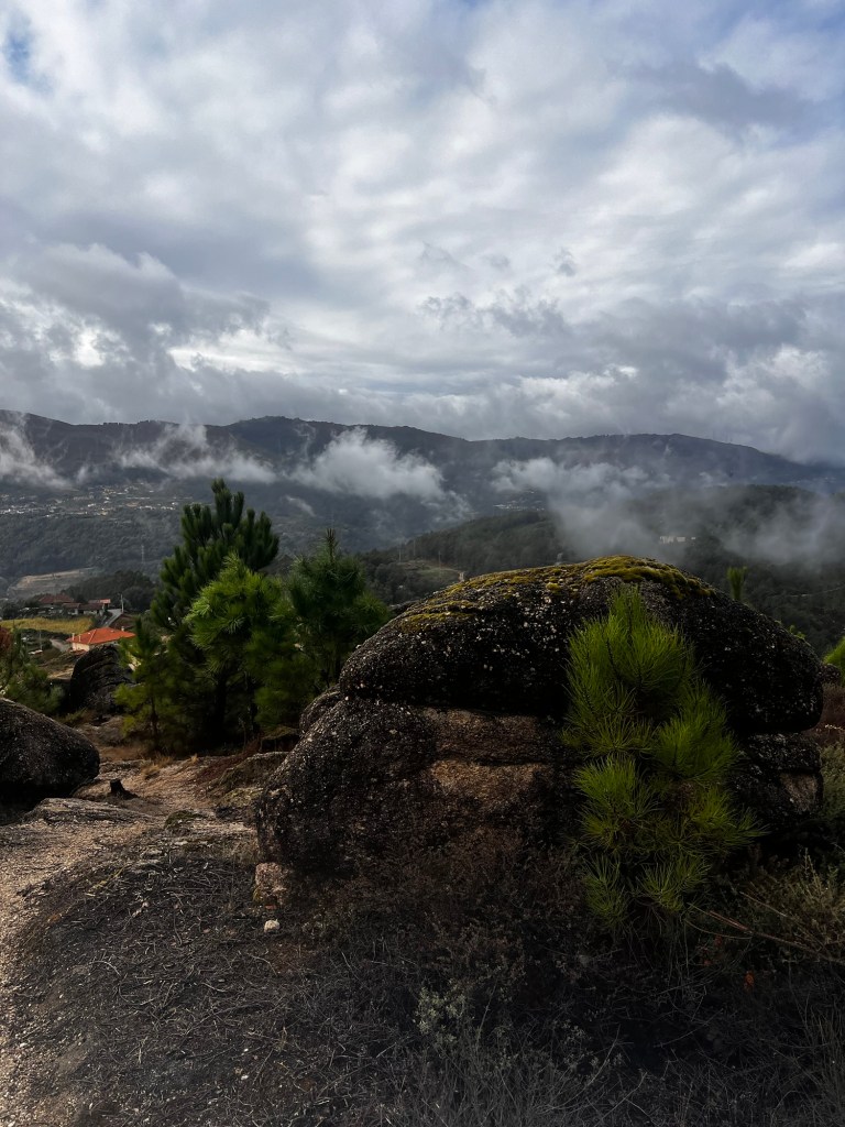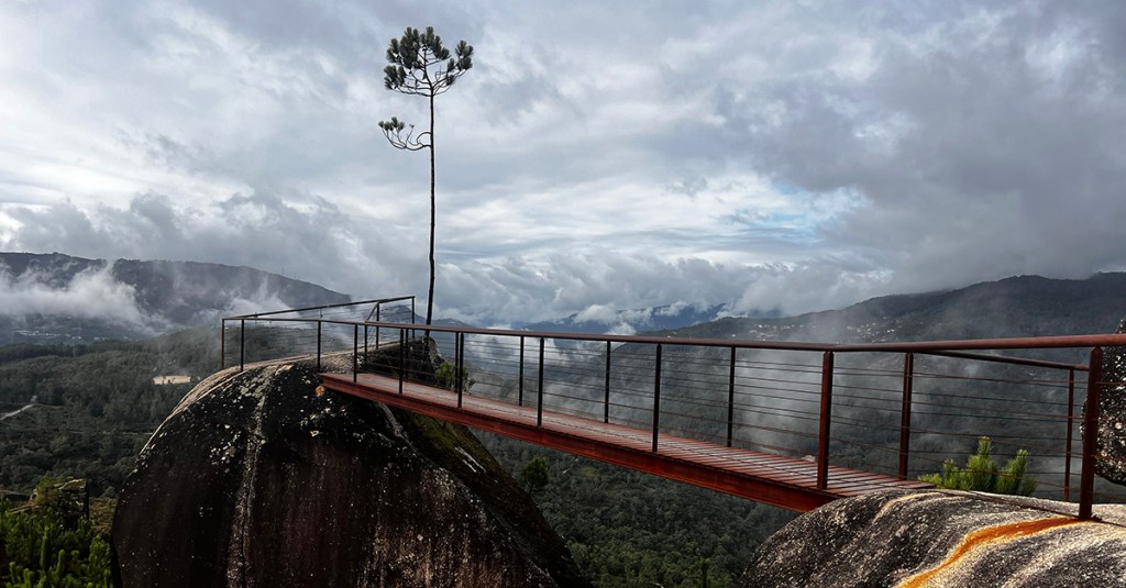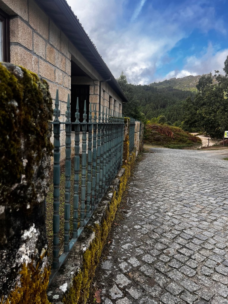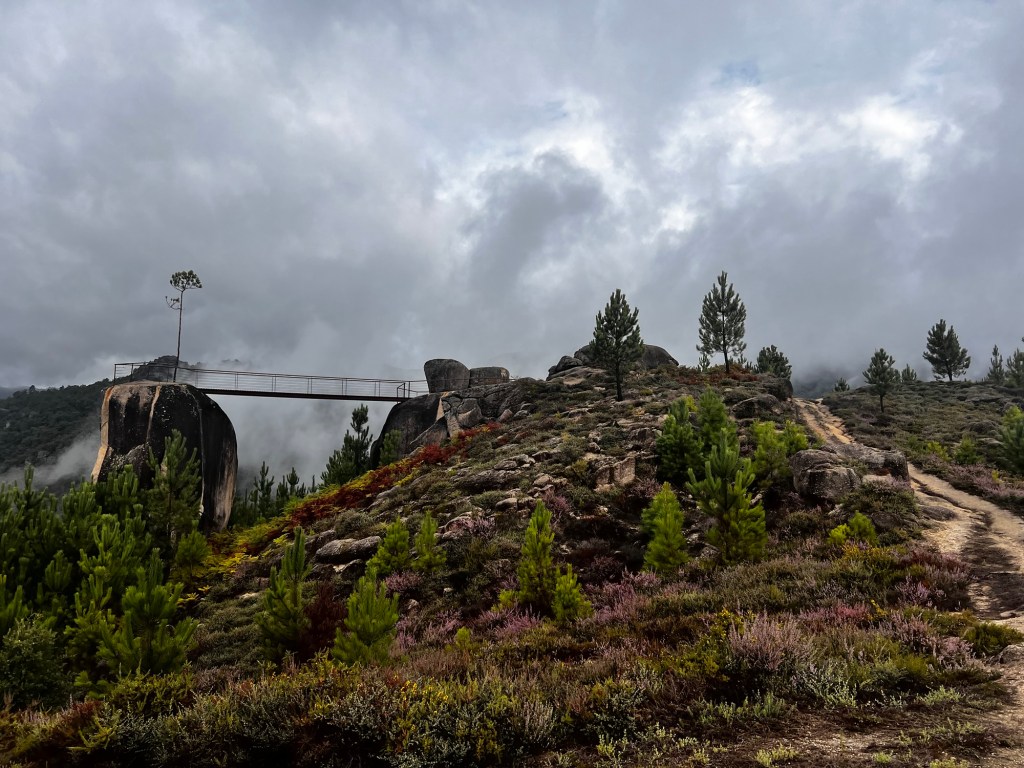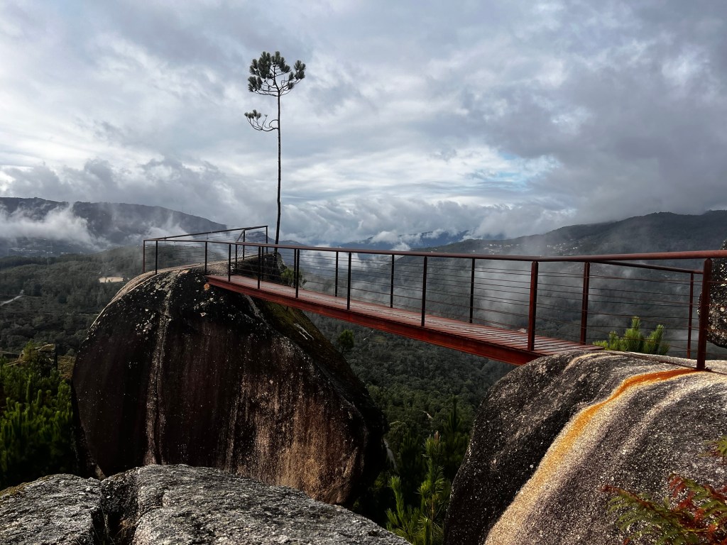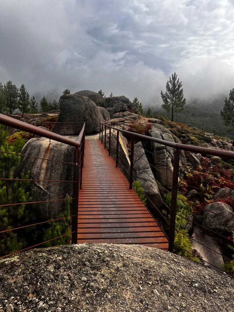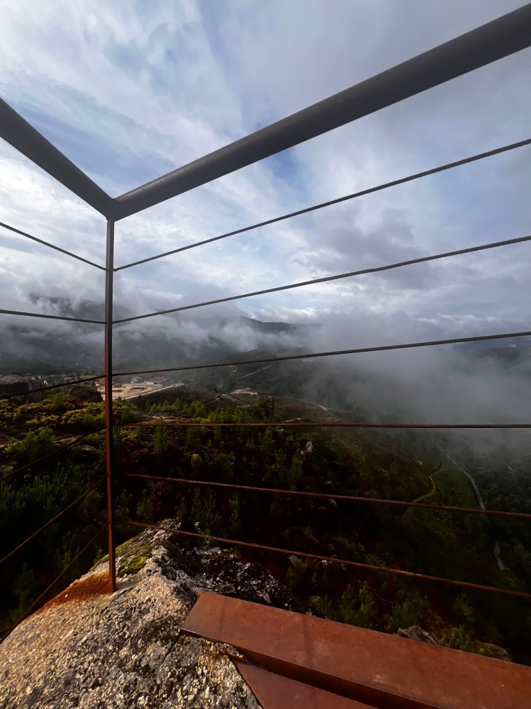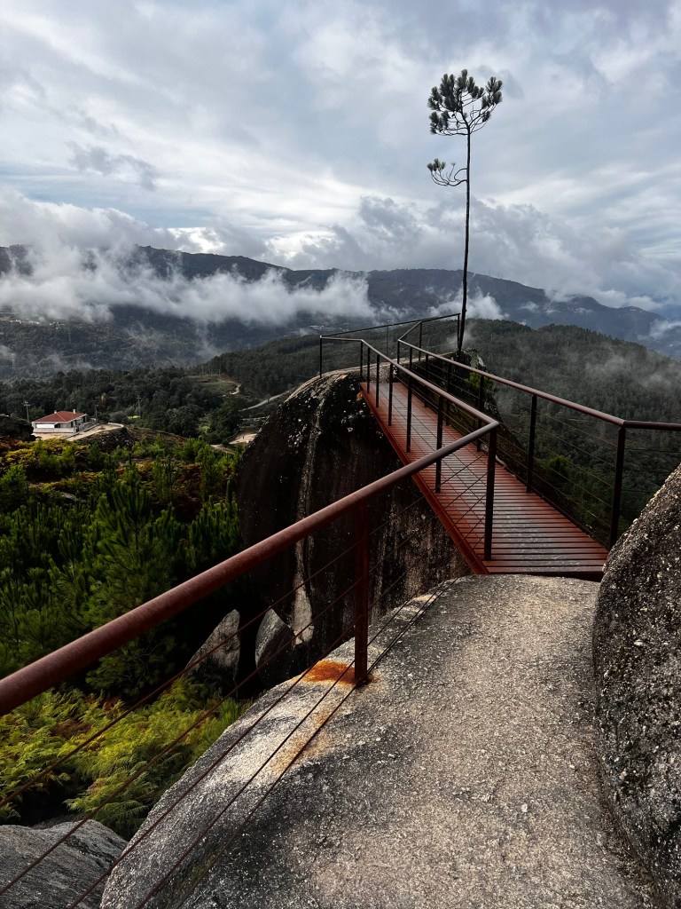 Our first stop was the Miradouro de Fafião. We went down a random road and parked in a little pull off that GoogleMaps directed us to. We walked up the road a tiny bit, and we saw signs for the actual lookout. When we got up to it, there was this metal bridge to a random rock with a viewing platform… I’m sure the bridge was fine, but it sure felt rickety when I walked across it! The view was cool, of a big reservoir down the valley and the mountains all around. The bridge and the rock it connected to was cooler.